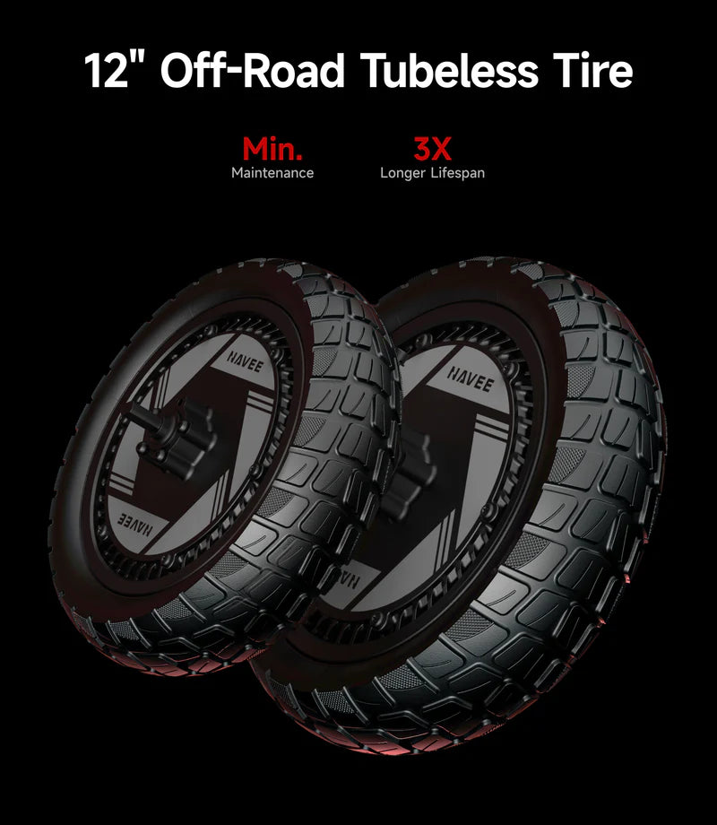 Equipped with NAVEE’s Patented Damping Arm™ suspension system, the XT5 Pro uses a front and rear arm structure to help absorb road vibrations and impacts. The large 12-inch tubeless off-road tires, combined with TCS anti-slip control, enhance traction and riding stability on loose or wet surfaces.