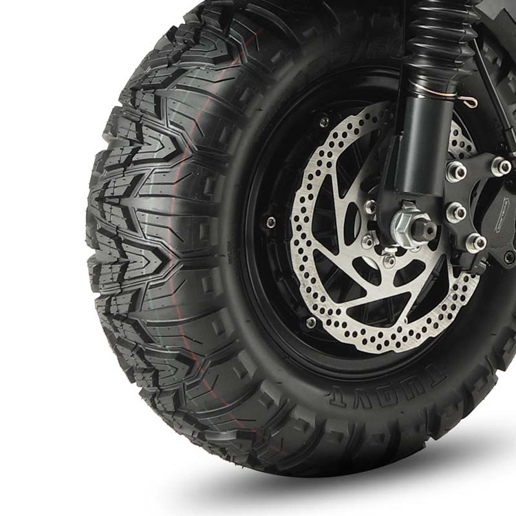 The dual hydraulic suspension in the front and dual shock absorbers in the rear provide excellent ride comfort. This system efficiently absorbs shocks and bumps, delivering smooth handling and stability across different terrains, whether on city streets or rougher off-road paths.